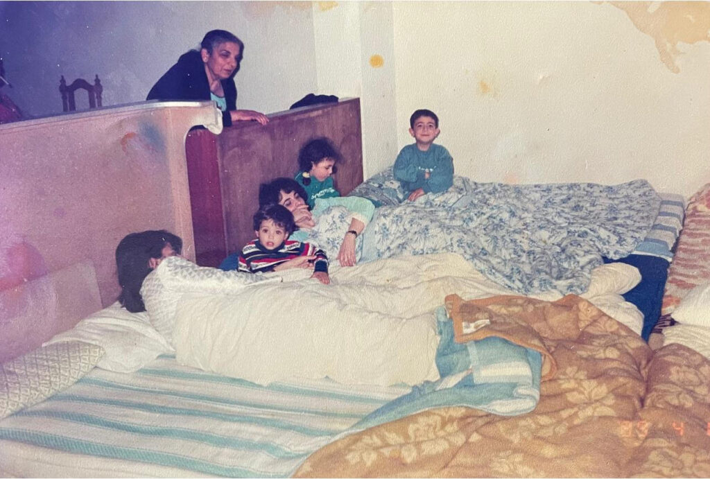 شارل حايك يتوسط اولاد عمه في الملجئ حيث كان والده و اعمامه يعزفون الموسيقى لتشتيت الاطفال عن اصوات القذائف.